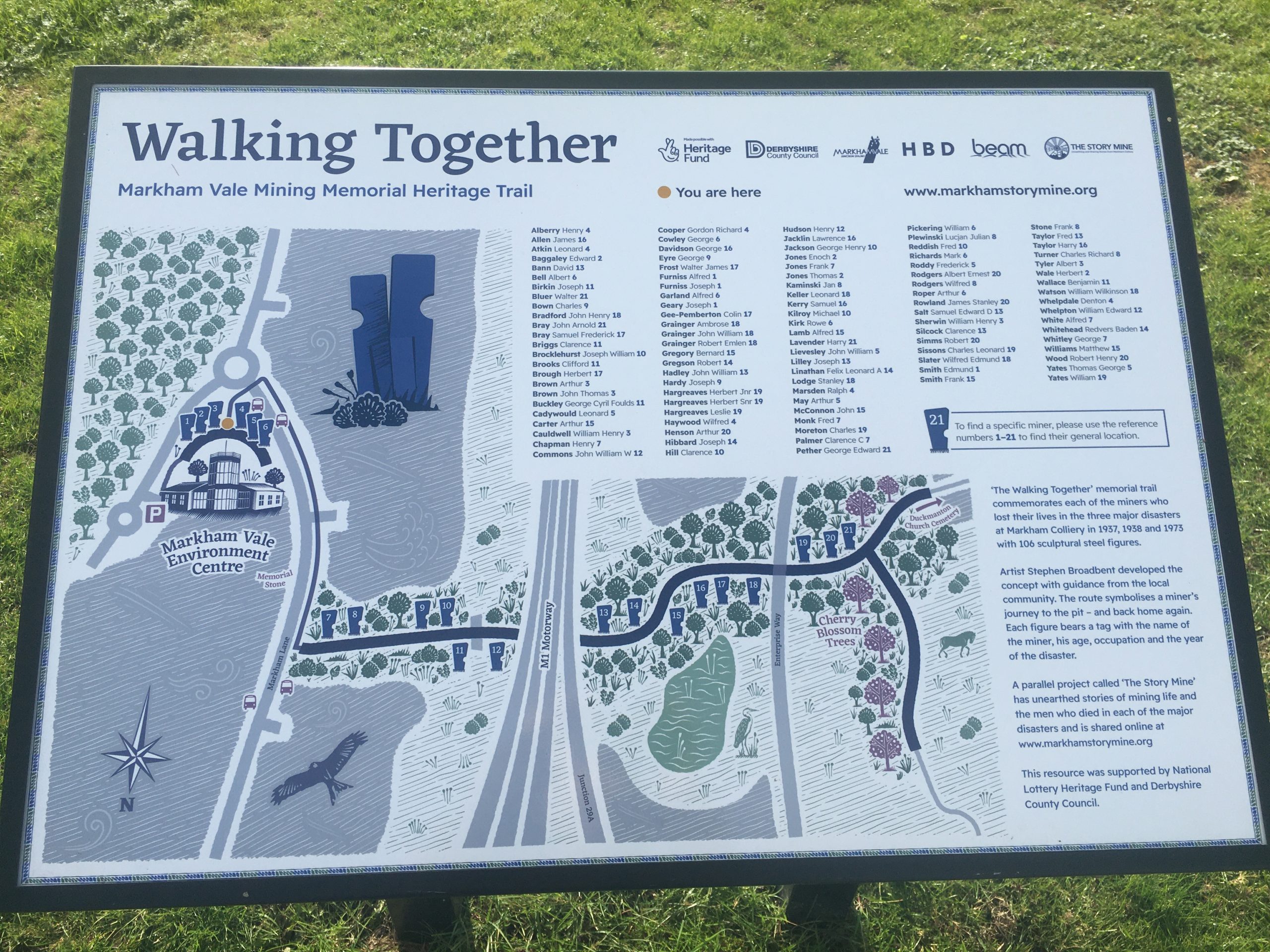 Cheshire-based Artist Stephen Broadbent designed the memorial supported by Markham Vale Heritage Group volunteers who researched the lives of the miners who were commemorated.
