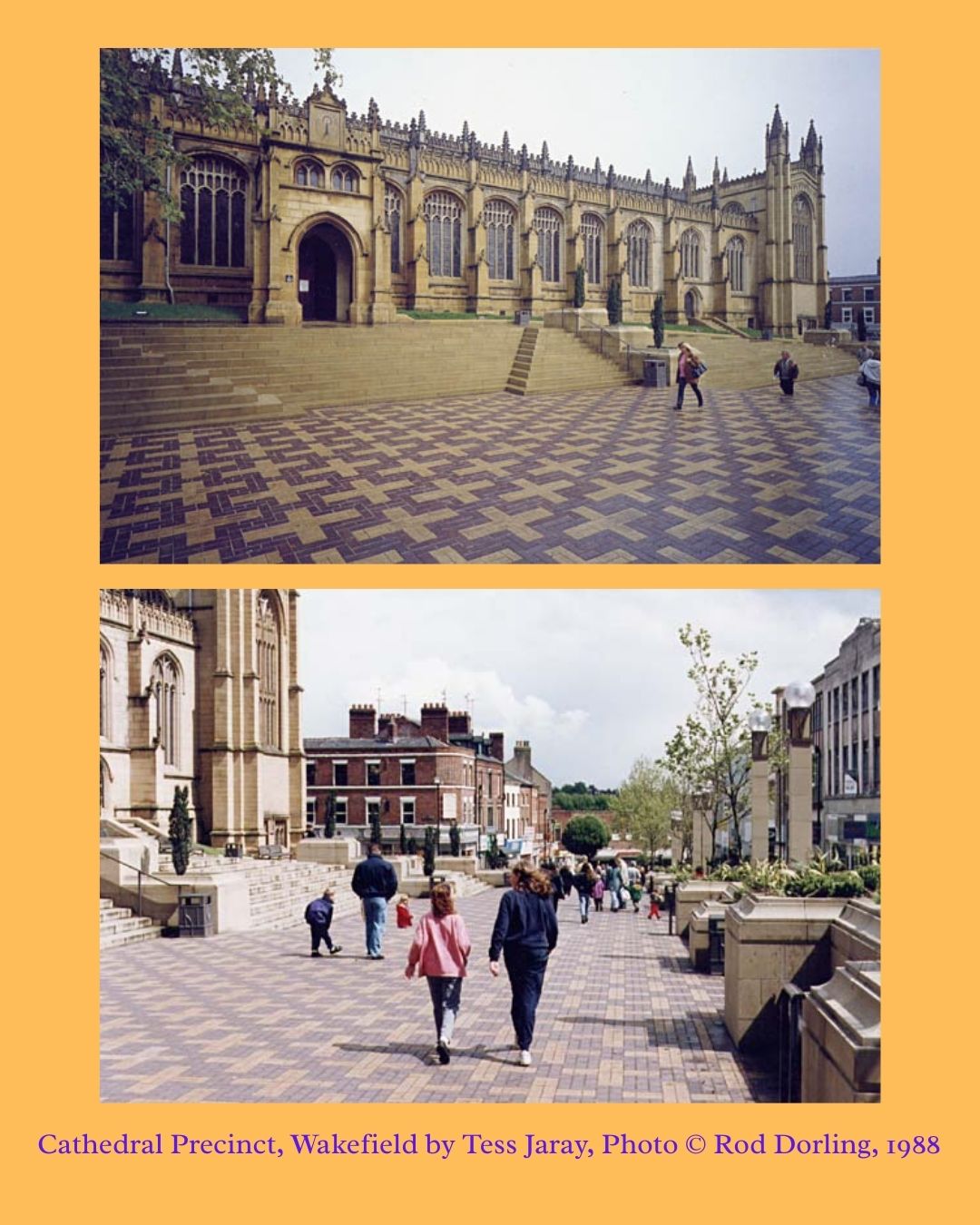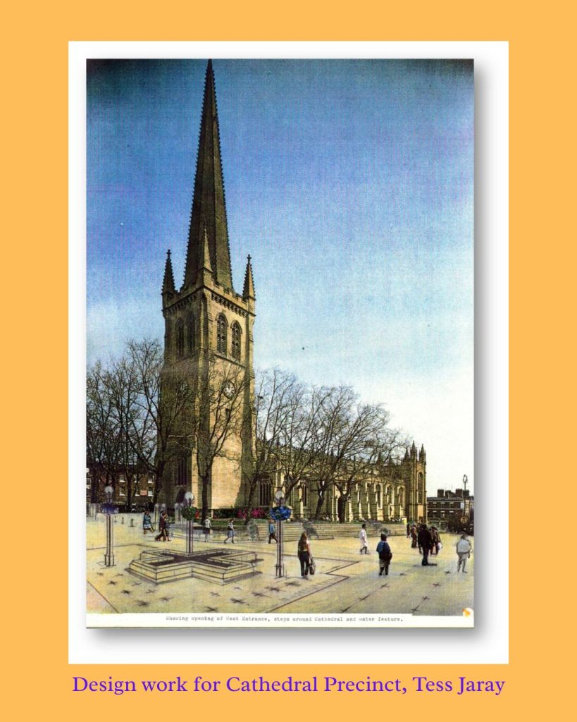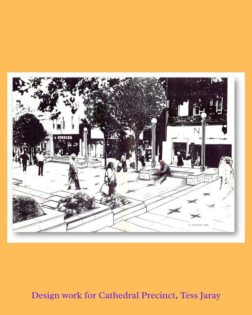 In 1989, artist Tess Jaray was commissioned by Public Arts and Wakefield Council to reimagine the Cathedral precinct. Her beautifully handmade proposal (now in our archive) gives rare insight into her process — and the final design is still going strong today.