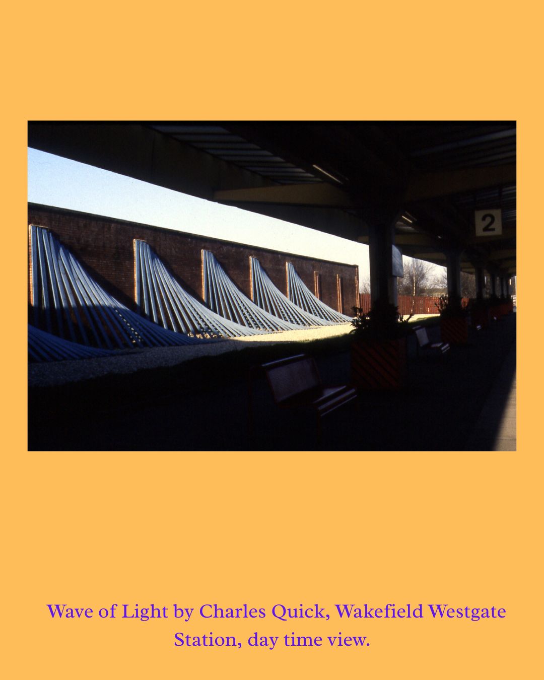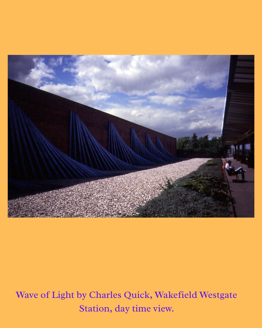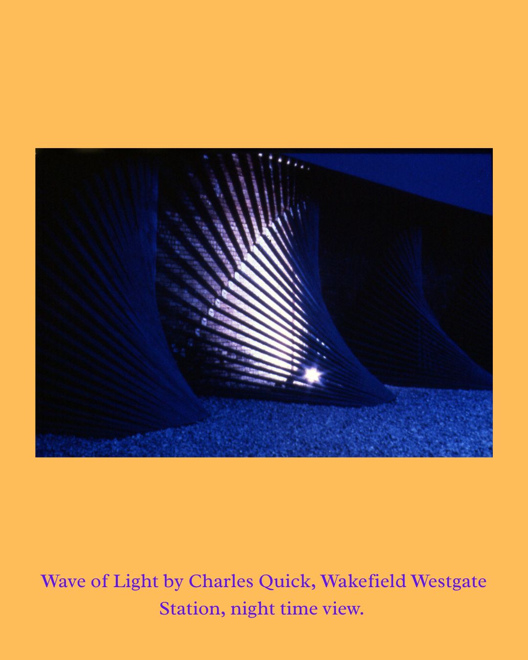 One of our very first commissions was A Light Wave by Charles Quick at Wakefield Westgate Railway Station in 1987, made for British Rail and visible to passing train passengers. The work moved away from figurative public art towards bold, rhythmic geometry — dramatically lit at night. It gave a platform to a young artist and stayed in place until 2009.